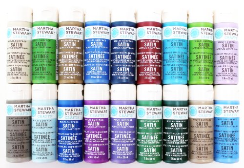 Martha Stewart 2 oz Paint-Best Selling Colors II. Features: High-Performance, premium acrylic patented polymer resin system . Formulated for use on all surfaces including wood, glass, ceramic, terra cotta, metal and fabric. UV and weather resistant for indoor and outdoor use. Extra adhesion on glass. Top-shelf dishwasher safe. Martha Stewart 2 oz paint-Best Selling Martha Stewart Satin Paint Colors II. Contains 18-2oz bottles: Putty, Scottish Highlands, Sycamore Bark, Greek Tile, Wild Blueberry, Chiptotle, Pond, Spring Pasture, Hydrangea, Gray Wolf, Summer Haze, Indigo, Pacific Iris, Pesto, P
